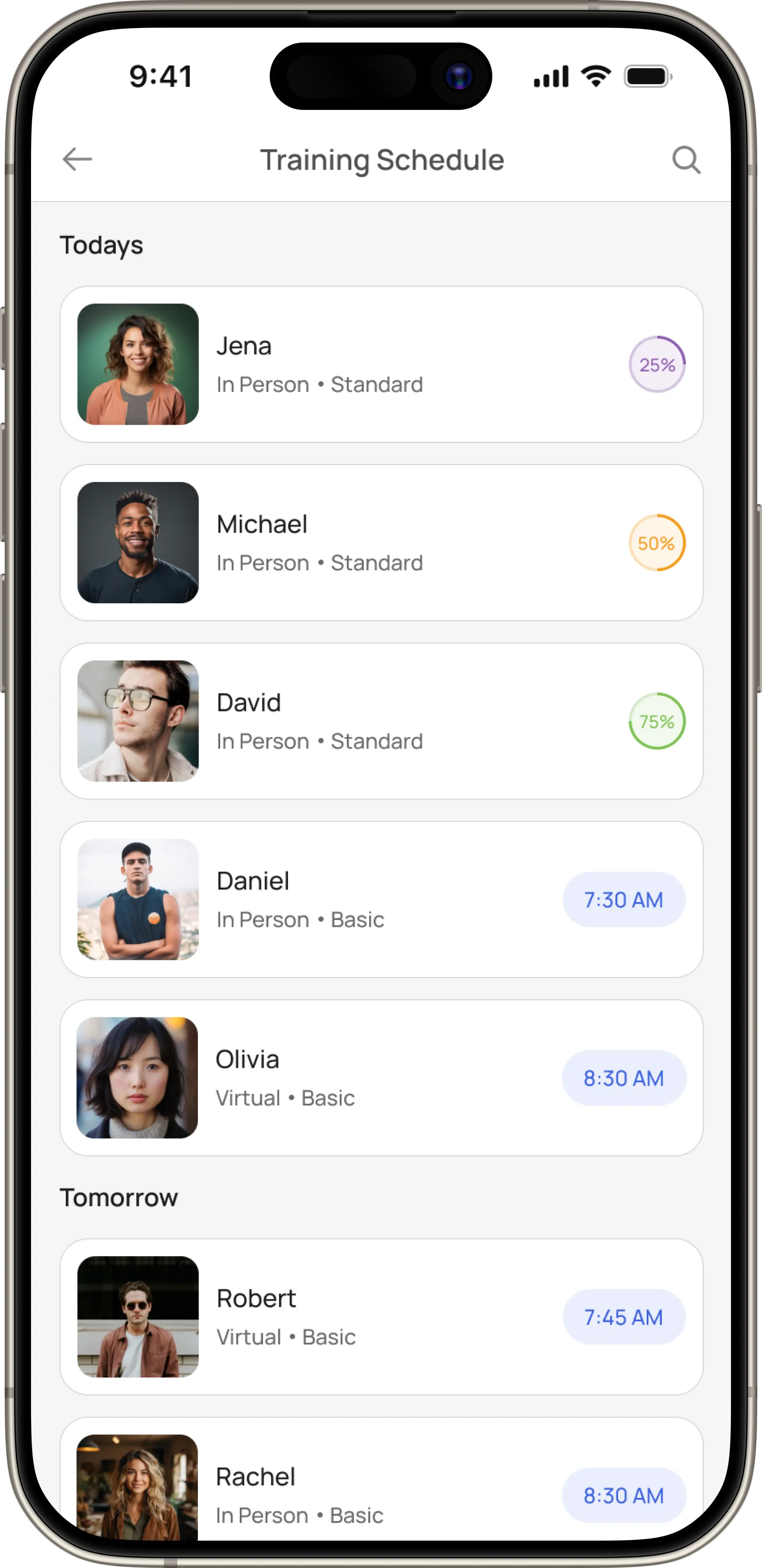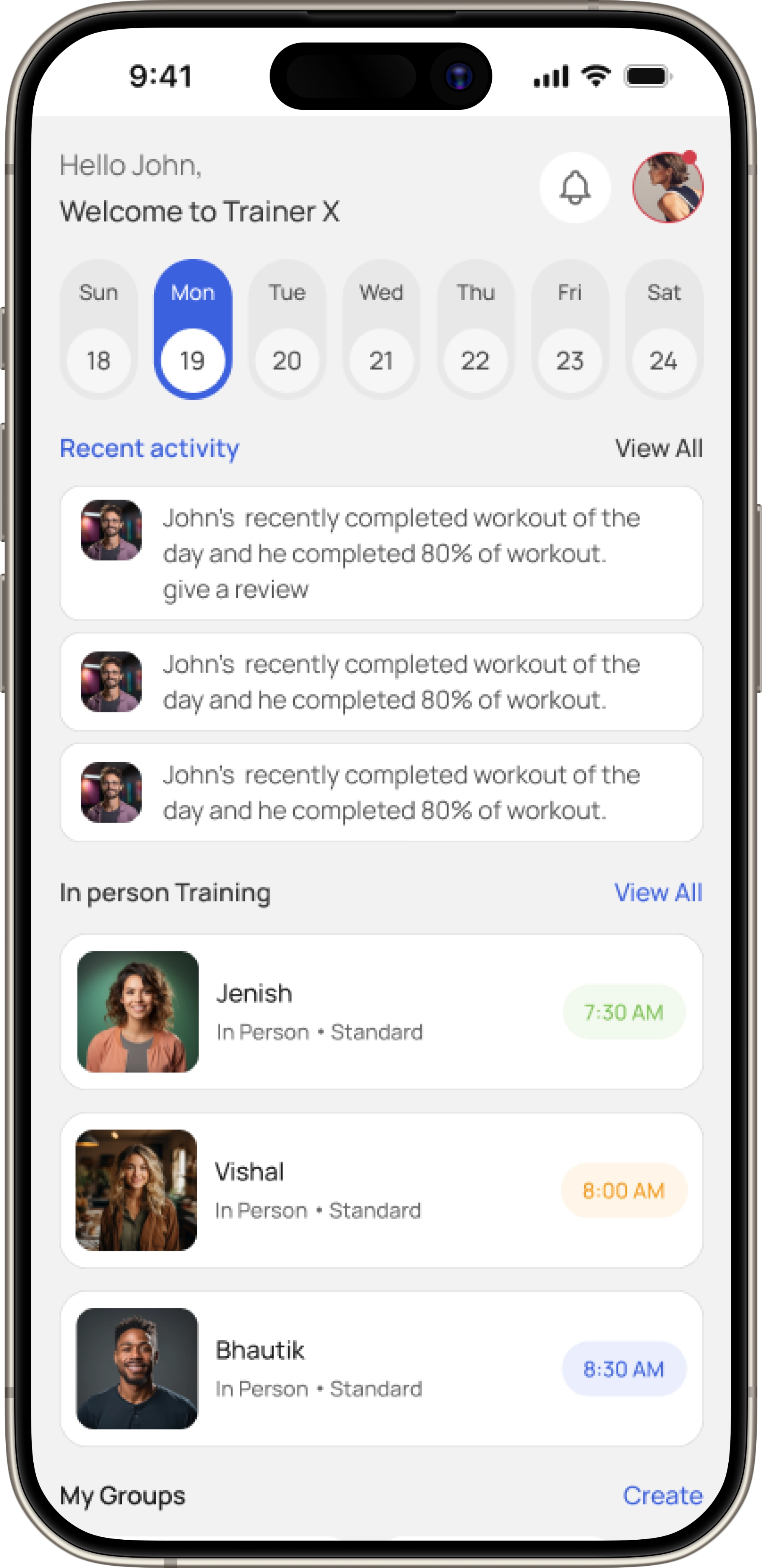 Offers trainers a clear snapshot of upcoming sessions, recent activities, and quick access to each client’s workout and performance summary.