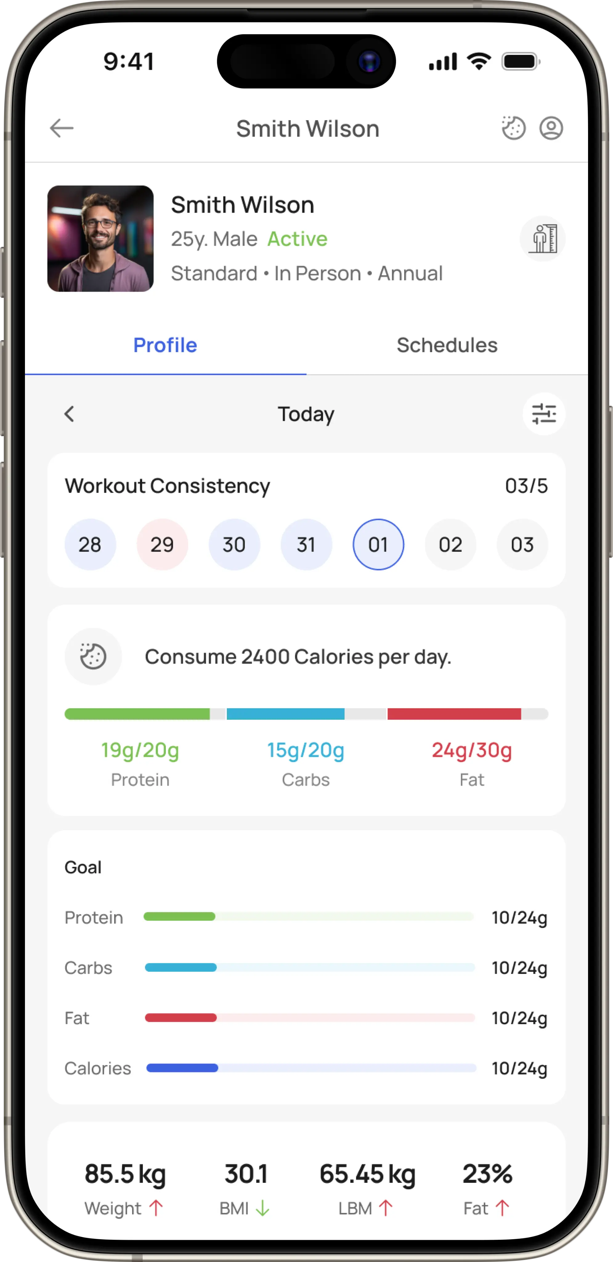 Displays each client’s completed and pending workouts while allowing trainers to create, customize, and assign new routines tailored to individual goals.