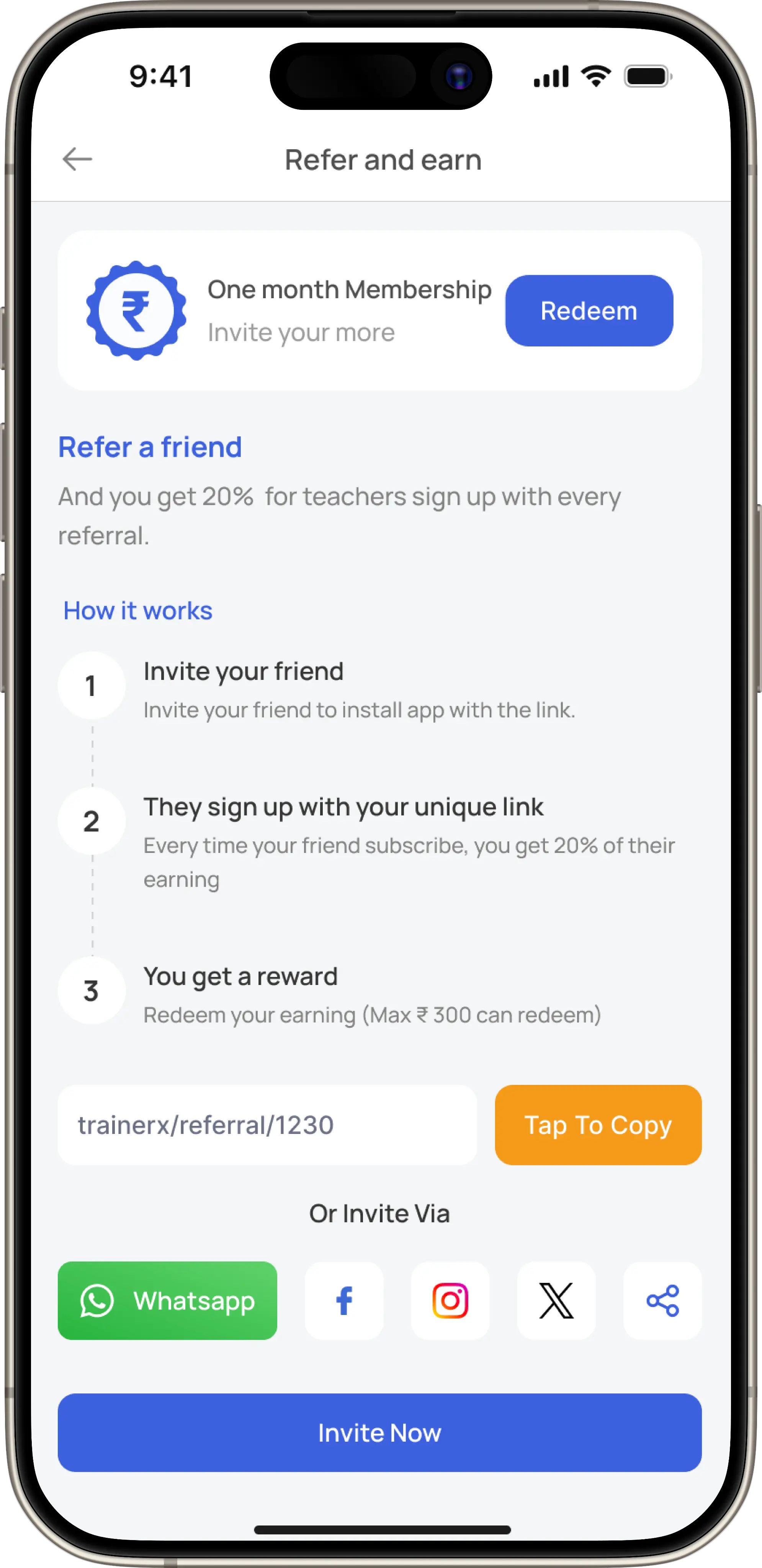 Encourages trainers to grow their network with a referral program, rewarding users for inviting peers to join the Trainer X platform.
